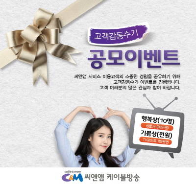 응모방법은 씨앤앰 홈페이지 ‘고객 감동 수기’ 게시판에 올리거나, 우편접수(서울시 강남구 삼성동 테헤란로 103길 9 제일빌딩 4층 CS기획팀 고객감동수기 담당자 앞) 또는 이메일(yeh0215@cnm.co.kr)로 접수할 수 있다.