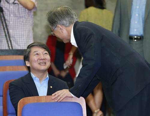 ▲지난 9일 의원총회에서 문재인 대표(오른쪽)와 인사하고 있는 안철수 전 대표. (사진=연합뉴스)