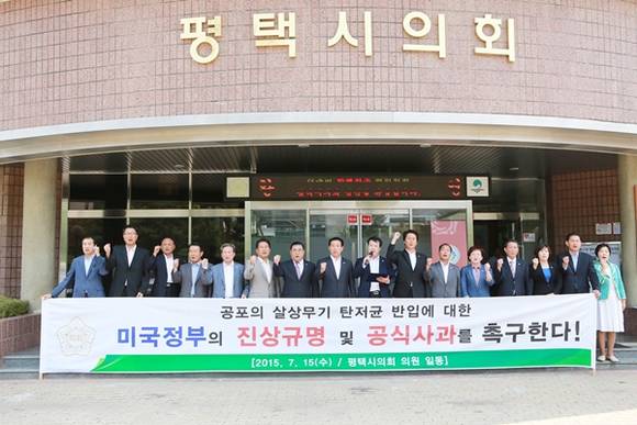 평택시의회(의장 김인식) 의원 일동은 15일 제176회 제1차 정례회 폐회 후 의회 현관 앞에서 미국정부를 규탄하는 탄저균 반입에 대한 미국정부의 진상규명 및 공식사과 촉구 성명서를 발표했다.