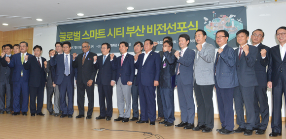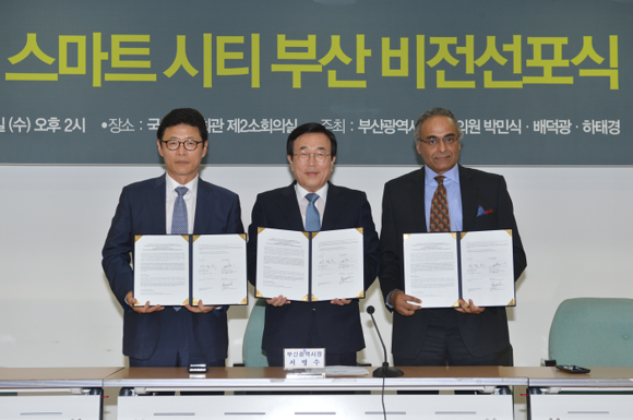 15일 오후 국회 의원회관에서 사물인터넷 기반의 글로벌 ICT 허브도시 조성을 위한 '글로벌 스마트시티 부산 비전선포식'이 열린 가운데, 지난해 10월 ITU전권회의에서 부산시와 SKT, 시스코 간에 체결한 MOU를 구체화하고 스마트시티 조성을 위해 실행력을 갖추기 위한 기본협약식이 진행됐다. 왼쪽부터 이형희 SKT MNO 총괄, 서병수 부산시장, 아닐메논 시스코 S+CC 및 글로벌라이제이션 부문 총괄사장. (사진제공=부산시)