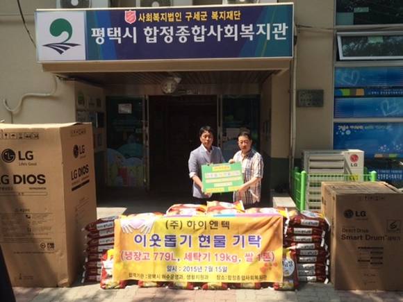(주)하이엔텍은 신뢰받는 기업, 공헌하는 기업을 경영이념으로 자사 제품기부와 소외계층을 위한 봉사활동을 통해 지역사회봉사에 동참해 오고 있으며 2013년에도 관내 아동복지시설에 냉장고(779ℓ)와 세탁기(15kg)를 전달한 적이 있다.