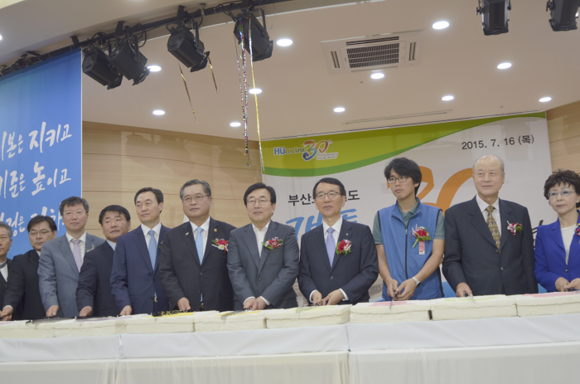 16일 오전 10시 30분 부산교통공사 9층 강당에서 '부산도시철도 개통 30주년' 기념식이 열린 가운데, 서병수 부산시장, 이해동 부산시의회 의장, 권기선 부산지방경찰청장, 박종흠 부산교통공사 사장을 비롯한 관계자들이 기념떡 커팅을 하고 있다.