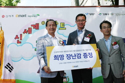 ▲16일 복조리시장에서 희망장난감도서관 37호점 개관 기념식이 열린 가운데 이원회 이마트 천호점장(가운데)이 육근목 길동복조리시장 상인회장(좌측)에게 희망 장난감 증정패를 전달하고 있다. (사진=신세계)