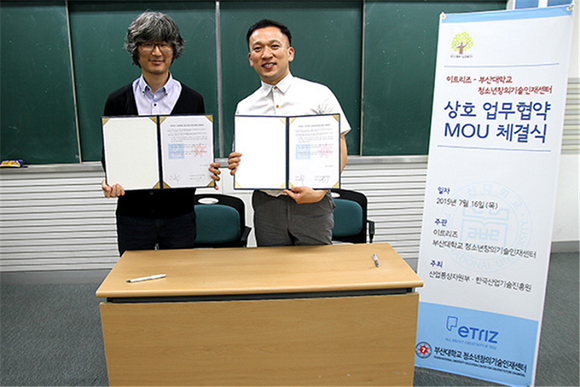 부산대(총장 김기섭) 청소년창의기술인재센터는 창의성 및 문제해결 방법론을 전문적으로 교육·컨설팅하는 기업인 이트리즈(eTRIZ, 대표 신정호)와 16일 교내 산학협동관 202호에서 상호 업무협약을 위한 MOU를 체결했다.