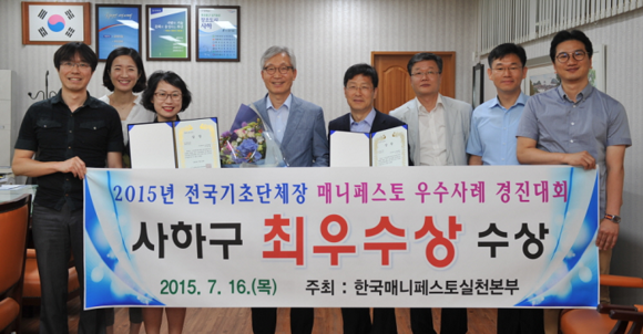 부산 사하구(구청장 이경훈)가 15, 16일 한국매니페스토실천본부 주관으로 경희대학교 국제캠퍼스에서 열린 '2015 전국기초자치단체장 매니페스토 우수사례 경진대회'에서 부산에서는 유일하게 최우수상을 수상했다.