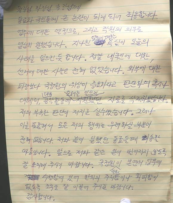 유서에는 "동료와 국민들에게 논란이 되어 죄송하다는 내용과 업무에 대한 욕심이 현재의 결과를 가져왔고 내국인 및 선거에 대한 사찰은 없었다는 내용이 포함되어 있는데 유족의 동의가 있어서 그 외 상세한 내용을 유서 사본을 통해 공개하게 되었다"고 경찰은 전했다.