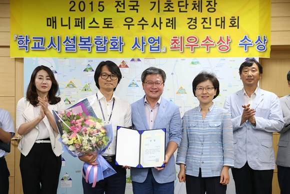 화성시 학교시설복합화 사업이 지난 16일 경희대학교 국제캠퍼스에서 열린 2015 전국 기초단체장 매니페스토 우수사례 경진대회에서 공약 이행 부문 최우수상을 수상했다.