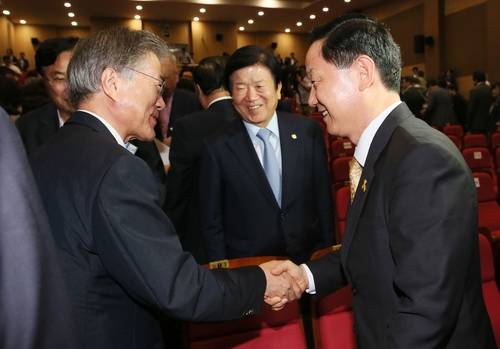 ▲새정치민주연합 문재인 대표(왼쪽)와 김상곤 혁신위원장이 20일 국회 의원회관에서 열린 중앙위원회에서 사무총장직 폐지를 골자로 한 1차 혁신안이 통과된 뒤 환하게 웃으며 악수하고 있다. 가운데는 박병석 의원(사진=연합뉴스)