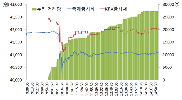 한국거래소(KRX, 이사장 최경수)에 따르면, 20일 국제 금시세가 지난 주말 종가(1134.34 달러)대비 2.2% 급락하며 KRX금시장에서 개인투자자의 저가매수세가 대거 유입되며 올 들어 최고 거래량인 27.8kg 기록한 것으로 나타났다.