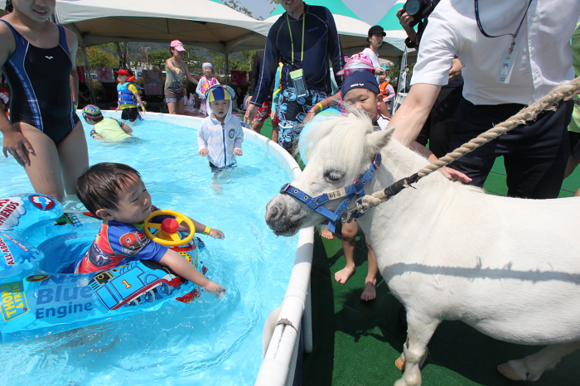 ▲미니호스를 보며 물놀이 중인 어린이들 모습.