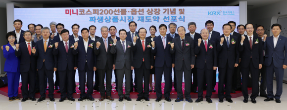 한국거래소(KRX, 이사장 최경수)는 20일 오전 부산본사 51층 홍보관에서 '미니코스피200 선물·옵션 상장 기념 및 파생상품시장 재도약 선포식'을 개최했다. 왼쪽부터 안동원 BNK투자증권 대표이사, 홍성국 KDB대우증권 대표이사, 김원규 NH투자증권 대표이사, 이종철 부산시 남구청장, 황영기 금융투자협회장, 김용범 금융위 증선위원, 최경수 거래소 이사장, 김규옥 부산시 경제부시장, 박인호 거래소 상임위원, 정연대 코스콤 대표이사, 곽두희 거래소 사외이사, 강기원 거래소 파생상품본부장. (사진제공=거래소)