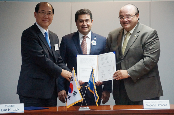 ▲왼쪽부터 임기택 BPA 사장, 온두라스 알바라도 대통령, 오르도녜스 에너지 인프라부 장관. (사진제공=BPA)