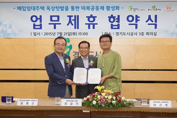 경기도시공사는 21일 본사에서 경기농림진흥재단, 경기도 따복공동체지원센터와 매입임대주택 옥상텃밭을 통한 따복공동체 활성화 업무제휴 협약을 체결했다.