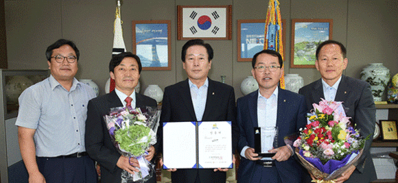 ▲착한 브랜드 상을 수상하고 기념촬영을 하고 있는 조억동 시장과 공직자들 (사진=광주시청)