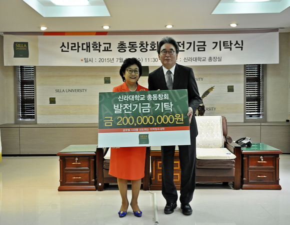 신라대학교 총동창회는 22일 오전 대학내 총장실에서 '발전기금 기탁식'을 갖고, 신라대 창학 60주년 기념관 건립 등을 위해 발전기금 2억원을 기탁했다.