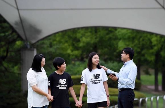 ▲지난 22일 수원시 광복 70주년 7천인 시민대합창 참가를 신청한 문병철, 지후, 지혁, 이혜경(오른쪽부터) 씨등 가족 4명이 8월 15일 공연이 열릴 수원제1야외음악당에 나와 합창곡을 불러보고 있다.(사진=수원시)