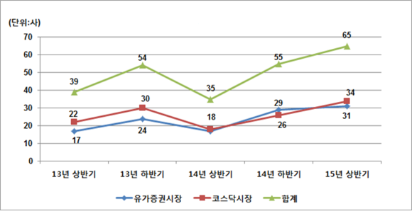 증권시장별로 구분하면 유가증권시장법인 31사(47.7%)와 코스닥시장법인 34사(52.3%)이고, 사유별로는 합병이 52사로 가장 많았으며, 영업양수·양도 7사, 주식교환 및 이전 6사 순이다.
