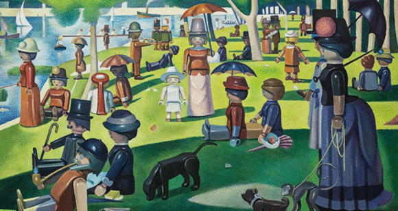 작가들은 레오나르도 다빈치, 미켈란젤로, 조르주 쇠라, 살바도르 달리 등 유명 예술가들의 명화 및 앤디워홀의 작품, 비틀즈의 앨범 속 장면 등을 패러디해 웃음을 자아낸다. 또 작가 고유의 예술적 세계관을 플레이모빌에 대비해 회화, 파노라마 그래픽, 일러스트레이션 및 설치 미술 등 다채로운 매체를 활용한 작품들도 눈길을 끈다.