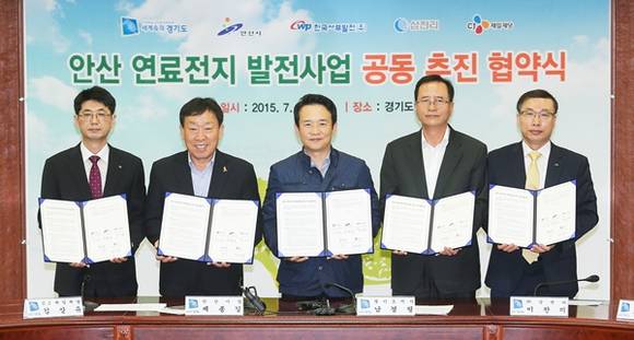 남경필 경기도지사와 제종길 안산시장, 이찬의 ㈜삼천리 대표, 정영철 ㈜한국서부발전 전무, 김상유 CJ 제일제당(주) 생산총괄은 27일 오전 10시 경기도청 상황실에서 이 같은 내용을 담은 안산 연료전지 발선사업 공동 추진을 위한 협약서에 서명했다. 이번 협약은 지난 달 25일 경기도가 발표한 2030 에너지 비전 발표 이후 첫 번째 성과라는 점에서 의미가 있다.