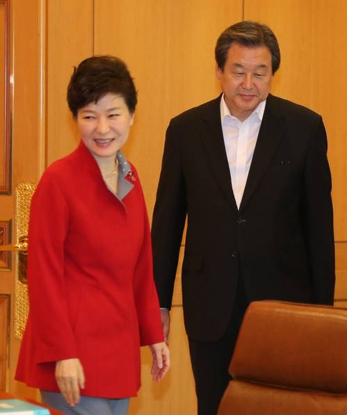 ▲지난 16일 박 대통령이 청와대를 방문한 김무성 대표 등 여당 지도부와 인사하고 나서 자리에 앉고 있다.(사진=연합뉴스)
