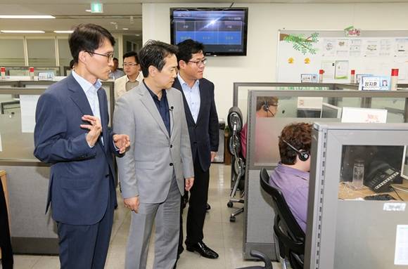 ▲남경필 경기도지사와 이기우 사회통합부지사가 ㈜에스원CRM의 사업장을 둘러보고 있다.