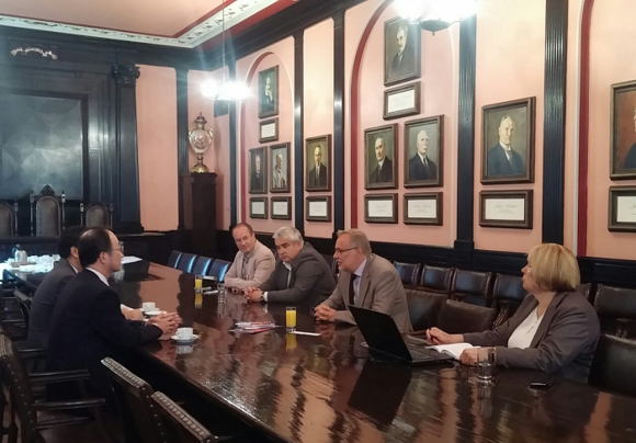 ▲김기섭 부산대 총장(왼쪽)이 라트비아대학에서 대학 관계자들과 교류협력 방안을 협의하고 있다. (사진제공=부산대)