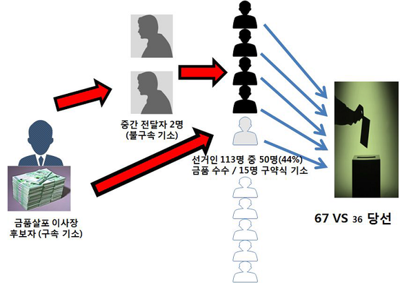 검찰에 따르면, A씨는 지난 2012년 8월경 모 새마을금고 이사장 보궐선거에 출마한 후, 선거인 46명에게 1410만원을 제공하고, B씨·C씨와 공모해 선거인 4명에게 120만원을 제공하는 등 전체 50명에게 총 1530만원을 제공한 혐의를 받고 있다.
