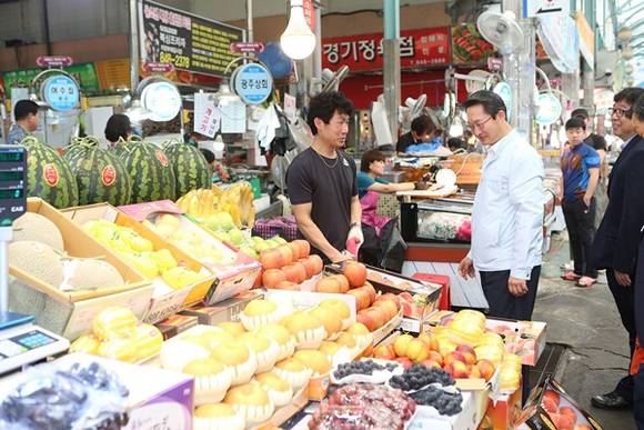 ▲31일 무더위 속에서 의정부 제일시장을 방문해 상인들의 애로사항을 청취하고 있는 김희겸 경기도행정2부지사. (사진=경기도)