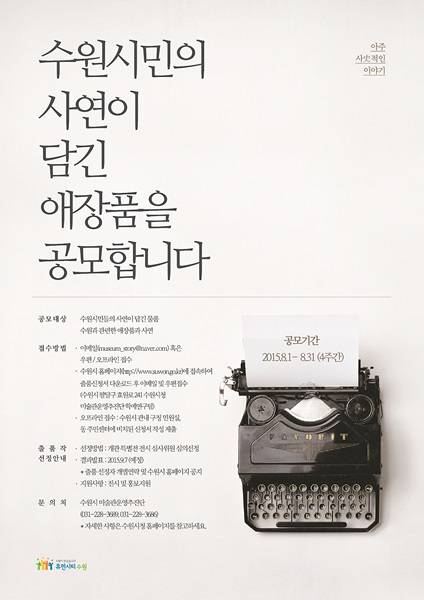수원시는 오는 10월 수원시립아이파크미술관 개관을 앞두고 개관 특별 시민 참여전에 전시될 시민 애장품을 공모한다. 아주 사적인 이야기라는 이름의 개관 특별전은 수원 시민들이 오랫동안 간직해왔던 물품 등 애장품과 그에 담긴 사연을 전시를 통해 이웃과 공유하고자 하는 시민 참여전이다.