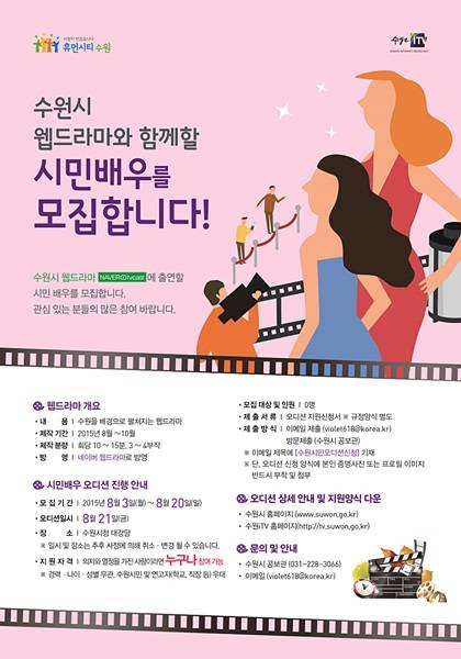 수원을 배경으로 펼쳐지는 웹드라마 왜 나는 너를 사랑하는가를 공개해 시민에게 좋은 반응을 얻었던 수원시가 웹드라마에 직접 출연할 시민 배우 오디션을 개최한다.