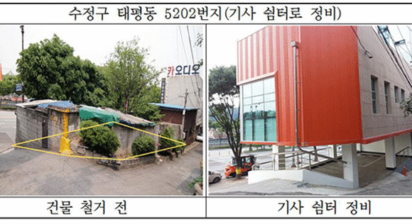 한편, 최근 2년간 시유지 내 빈집을 철거해 주민시설로 탈바꿈시킨 곳은 수정구 수진동 2493번지의 주민자율주차장, 수정구 신흥동 3822번지의 어머니자율방범대, 수정구 성남대로 1290-1(태평동)의 기사 쉼터 등이다.
