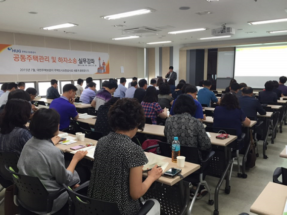 주택도시보증공사(HUG, 사장 김선덕)은 전국 공동주택 입주자대표, 관리소장, 건설사 등을 대상으로 '2015년도 공동주택관리 실무강좌'를 성황리에 마쳤다고 4일 밝혔다.