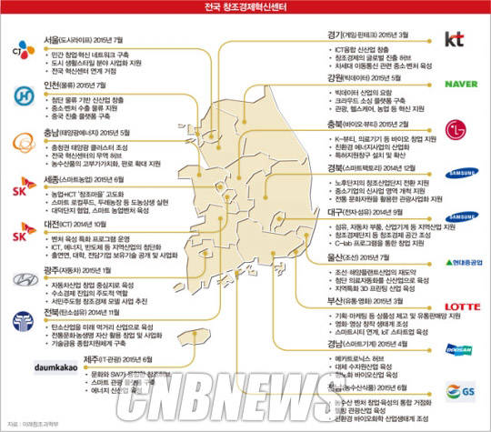 ▲전국 17개 시도에 문을 연 창조경제혁신센터. 대기업들이 지역을 나눠 혁신센터를 책임지고 있는데, 재벌의존도가 높다보니 활성화에 한계가 있다. (미래창조과학부 제공)