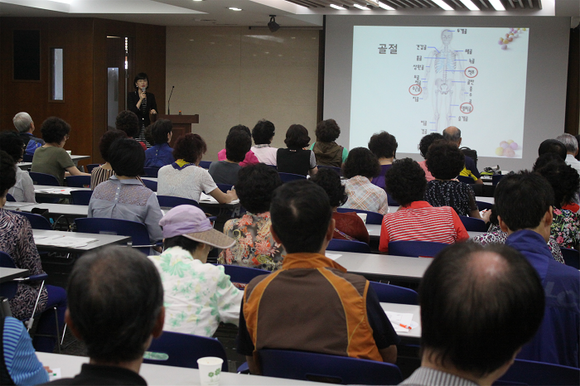 ▲지난달 23일 건협 부산센터가 주최한 335회 공개강좌에서 '골다공증이란 무엇인가요?'를 주제로 부산대병원 전윤경 교수가 강의하고 있다. (사진제공=건협 부산센터)