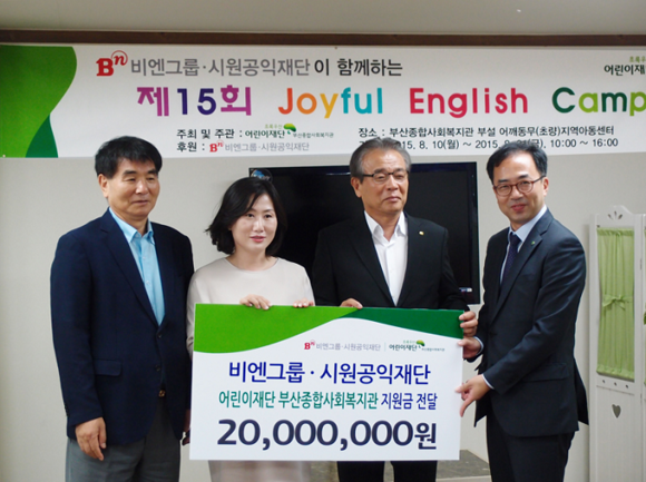 이날 행사에는 조성제 이사장(BN그룹 명예회장 겸 부산상공회의소 회장), 초록우산 어린이재단 이수경 부산지역본부장, 신경근 부산종합사회복지관장, 박선희 어깨동무초량지역아동센터장 등 내빈과 캠프 참여 아동 30여명, 한국인 및 원어민 영어강사 5명 등 40명이 참석했다.