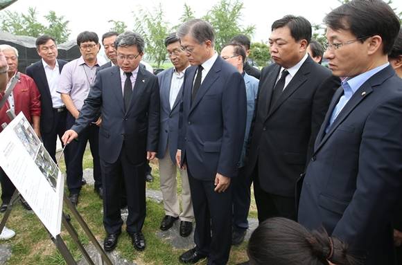 ▲채인석 시장으로부터 현안사항에 대해 설명을 듣고 있는 문재인 대표(사진=화성시)
