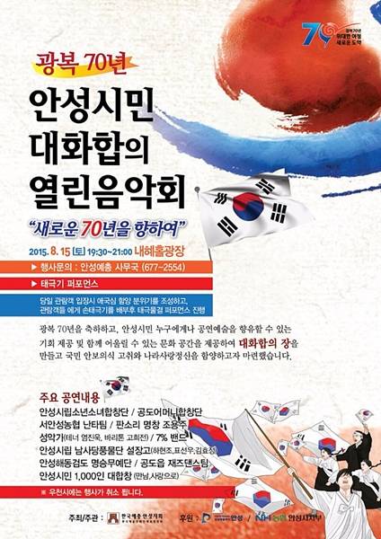 광복70년, 안성시민 대화합의 열린음악회가 오는 15일 저녁 7시 30분 석정동 내혜홀광장에서 열린다.