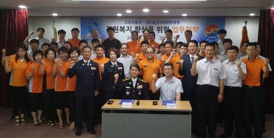 ▲일산자생병원 김창연 병원장(앞줄 오른쪽)과 박종행 고양소방서장이 업무협약을 체결하고 기념촬영을 하고 있다.(사진= 일산자생한방병원)