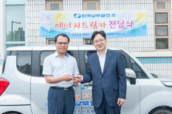 한국남부발전(사장 김태우)은 12일 본사가 위치한 부산 남구지역 교통취약계층을 위한 에너지카 전달식과 사회공헌 선포식 행사를 진행했다.