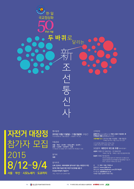 부산문화재단(대표이사 이문섭)은 주일본국대한민국대사관(대사 유흥수)과 올해 한·일 국교정상화 50주년 기념사업의 일환으로 10월 11일부터 11월 3일까지 양국 50명(한국25, 일본25)이 옛 조선통신사의 발자취를 따라 서울~부산~시모노세키~오사카~도쿄 간 약 2000km에 이르는 거리를 자전거로 달리는 '두 바퀴로 달리는 新 조선통신사' 행사를 개최한다.