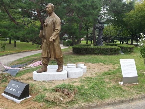▲오는 15일 제막식을 앞두고 수원올림픽공원에 설치된 독립운동가 필동 임면수 선생 동상