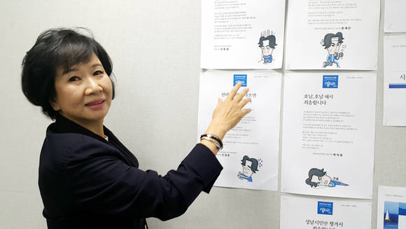 ▲새정치민주연합 손혜원 홍보위원장이 문재인 대표를 비롯해 박지원 전 원내대표, 이종걸 원내대표 등 당 지도부와 중진의원들의 '셀프디스'를 직접 설명하고 있다.(사진=손혜원 제공)