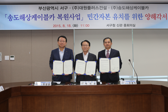부산 서구(구청장 박극제)는 18일 ㈜대원플러스건설(회장 최삼섭), ㈜송도해상케이블카(대표이사 최효섭)와 '송도해상케이블카 복원 사업'을 위한 양해각서(MOU)를 체결하고, 이에 따른 관광자원 개발로 지역 일자리 창출과 지역경제 활성화를 위해 상호협력하기로 했다. (사진제공=부산 서구)