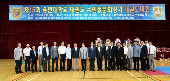지난 15일 대한민국 광복 70주년을 맞아 제15회 수원 용인대학교 동문회장기 태권도대회가 청소년문화센터에서 겨루기,개인품새,단체품새,격파,단체격파,태권체조,종합시범,장애물이단옆차기 종목에 대학교동문 태권도대회 최대 인원인 1500여명이 참가한 가운데 미래의 주역인 청소년들에게 꿈과 도전을 향한 축제의 한마당이 성황리에 개최 되었다.