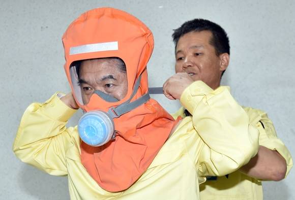 ▲민방위 훈련에서 방독면 착용을 하고 있는 이재정 경기교육감