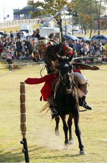 ▲화성행궁서 펼쳐지고 있는 마상무예 시범(사진=수원문화재단)