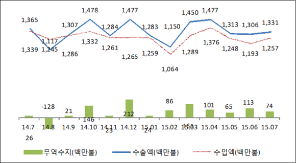 20일 부산세관이 발표한 '2015년 7월 부산지역 수출입 동향'에 따르면, 전년동월 대비 수출은 2.1% 감소한 13억3천만 달러, 수입은 6.2% 감소한 12억6천만 달러를 기록하며 무역수지 7천만 달러 흑자를 기록했다.