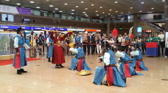 한국공항공사 부산지역본부(본부장 박순천)는 19일 김해공항에서 공항 이용객을 위해 창작 퍼포먼스 '천검의 귀환' 공연을 선보여 외국인과 어린이에게 큰 호응을 받았다.