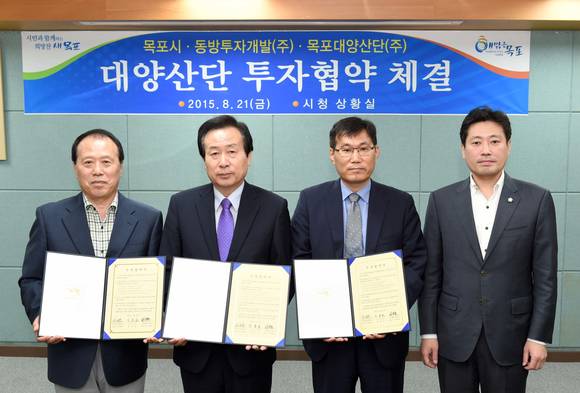 목포시는 21일 박홍률 목포시장, 동방투자개발(주) 최병권 대표이사, 대양산단(주) 최창호 대표이사, 조요한 시의회 관광경제위원장 등이 참석한 가운데 202억원 규모의 투자유치협약을 체결했다.