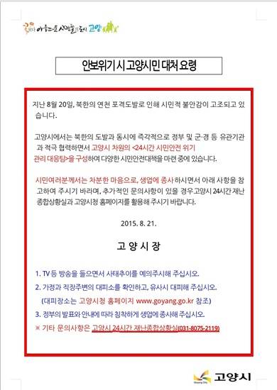 배포한 시민 대처요령은 △ TV 등 방송을 통해 사태 추의를 주시하고, △ 가정과 직장 주변의 대피소 확인 및 유사 시 대피방법과(대피장소는 고양시청 홈페이지 www.goyang.go.kr 참조) △ 정부 발표 및 안내에 따른 침착한 대응요령 등이다. 자세한 사항은 고양시 24시간 재난종합상황실(031-8075-2119)로 문의할 수 있다.